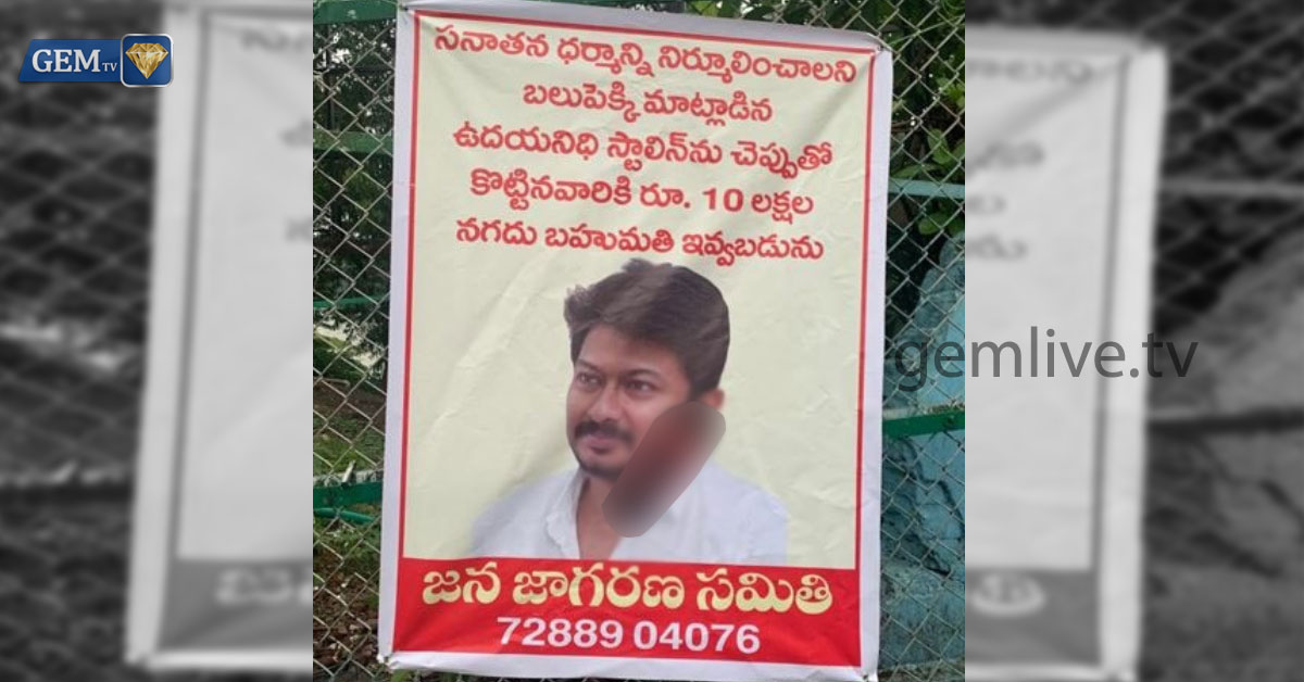 தற்போது ஆந்திர மாநிலம் விஜயவாடைச் சேர்ந்த “ஜன ஜாகரனா சமிதி” என்ற இந்துத்துவா அமைப்பு ஒரு அறிவிப்பு வெளியிட்டுள்ளது. அதில் சனாதனத்தை ஒழிப்போம் எனப் பேசிய தமிழக அமைச்சர் உதயநிதி கன்னத்தில் காலணியால் அறைந்தால் ரூ.10 லட்சம் பரிசு தரப்படும் எனத் தெரிவிக்கப்பட்டுள்ளது.