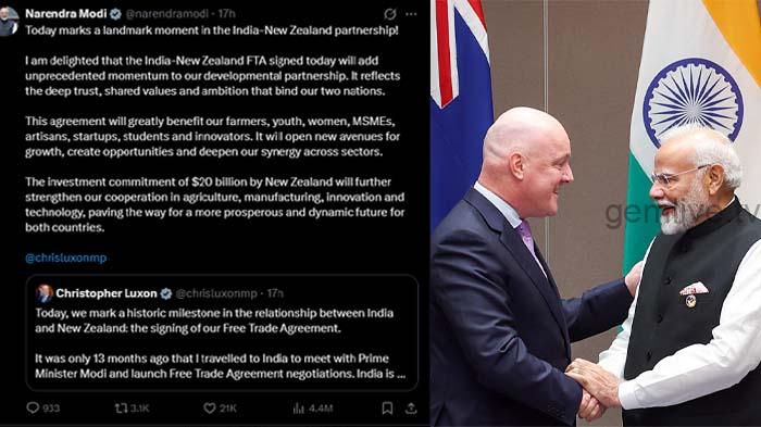 பிரதமர் மோடி தனது எக்ஸ் தளப் பதிவில், இன்று கையெழுத்திடப்பட்ட இந்தியா-நியூசிலாந்து தடையற்ற வர்த்தக ஒப்பந்தம், நமது வளர்ச்சிக் கூட்டாண்மைக்கு முன்னெப்போதும் இல்லாத உத்வேகத்தை அளிக்கும் என்பதில் தான் மகிழ்ச்சியடைவதாகத் தெரிவித்தார்.