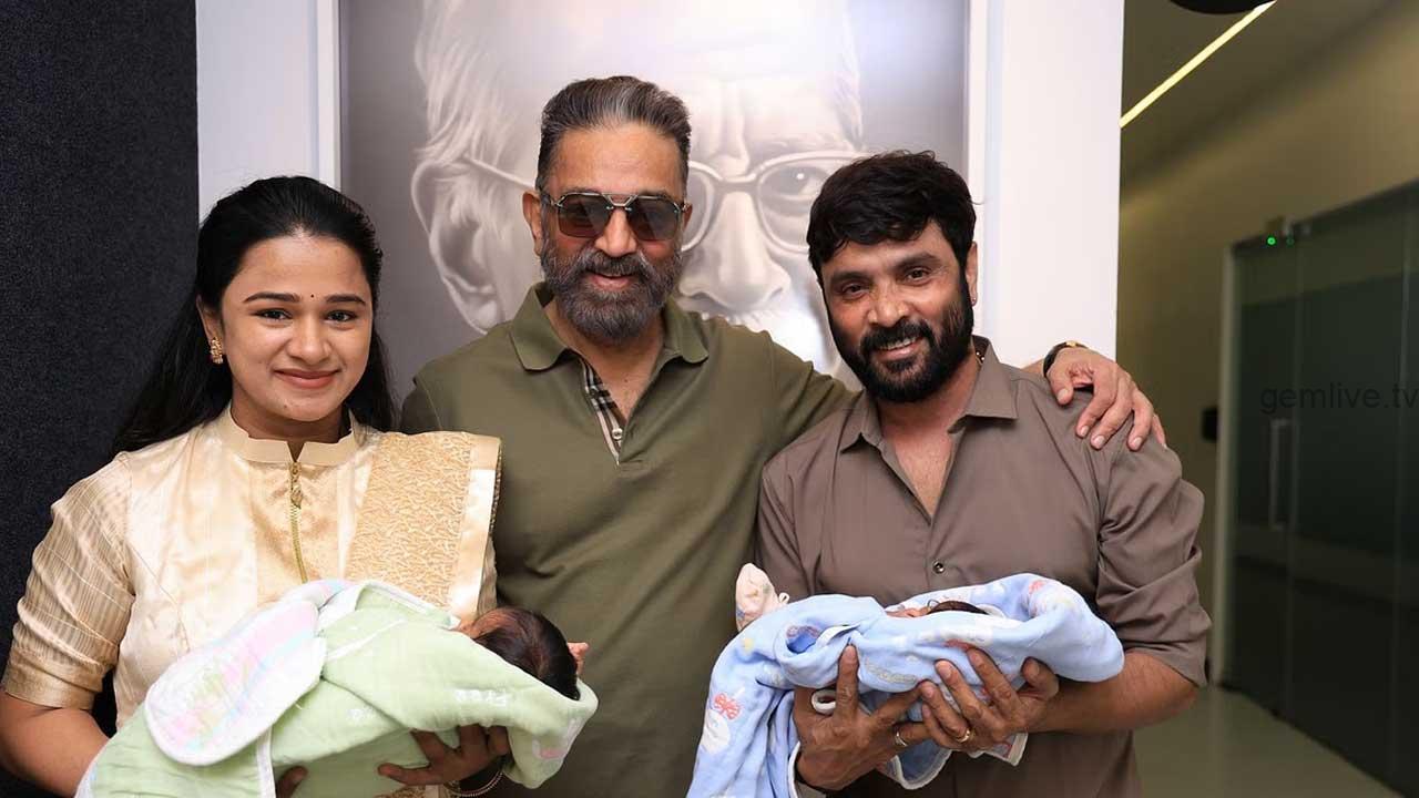 சில நாட்களுக்கு முன்பு, இந்தத் தம்பதிக்கு இரட்டை பெண் குழந்தைகள் பிறந்தன. இந்நிலையில், அந்தக் குழந்தைகளுக்கு நடிகர் கமல்ஹாசன் பெயர் வைத்துள்ளார் மற்றும் தங்க வளையல் சூட்டியுள்ளார்.