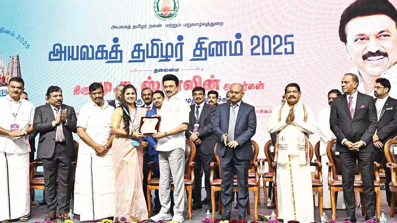 இப்போது, இந்த மேடையில், ஆறு முக்கிய துறைகளில் முத்திரை பதித்த சாதனைத் தமிழர்களுக்கு நான் விருதுகளை வழங்கியிருக்கிறேன். அதற்கு மணிமகுடமாக, அயலகத் தமிழர்களில் பன்முகத்தன்மையோடு விளங்கும் ஒரு தமிழரைத் தேர்ந்தெடுத்து, “தமிழ்மாமணி” விருதும் பட்டயமும் வழங்கியிருக்கிறோம்.