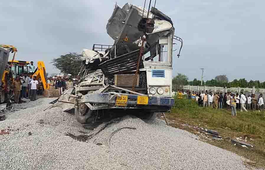 தெலங்கானாவில் பேருந்தும் லாரியும் நேருக்கு நேர் மோதிக் கொண்டதில் இருபது பேர் உயிரிழந்தனர். தெலுங்கானா மாநிலம் ரங்காரெட்டி மாவட்டத்தில் உள்ள சீவெல்லா காவல் நிலையத்தின் எல்லைக்கு உட்பட்ட கானாப்பூர் கேட்டுக்கு அருகே பேருந்தும் லாரியும் மோதிப் பெரும் விபத்துக்குள்ளானது.